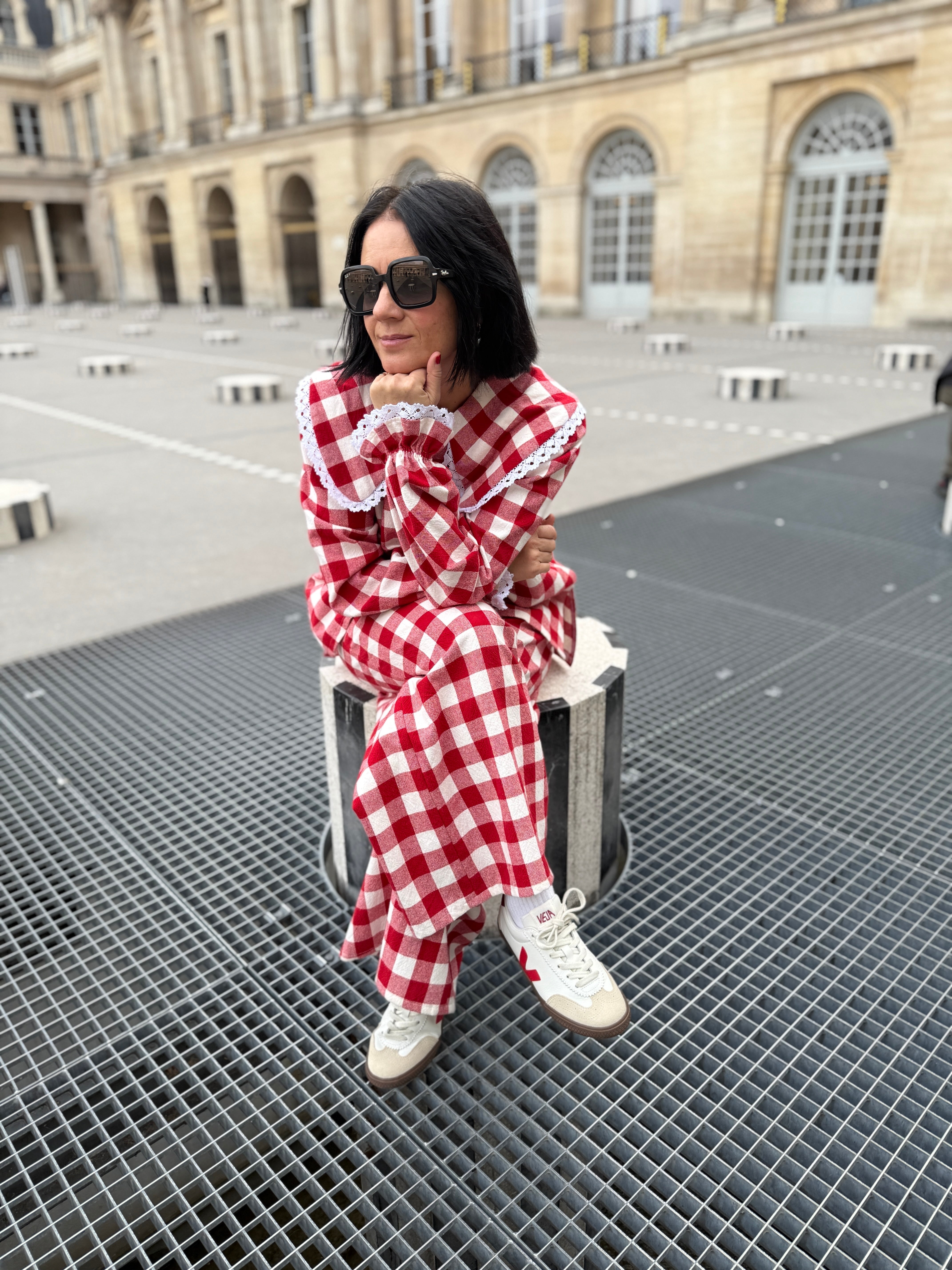 Cotton lace details in collar and cuffs. Made in France.