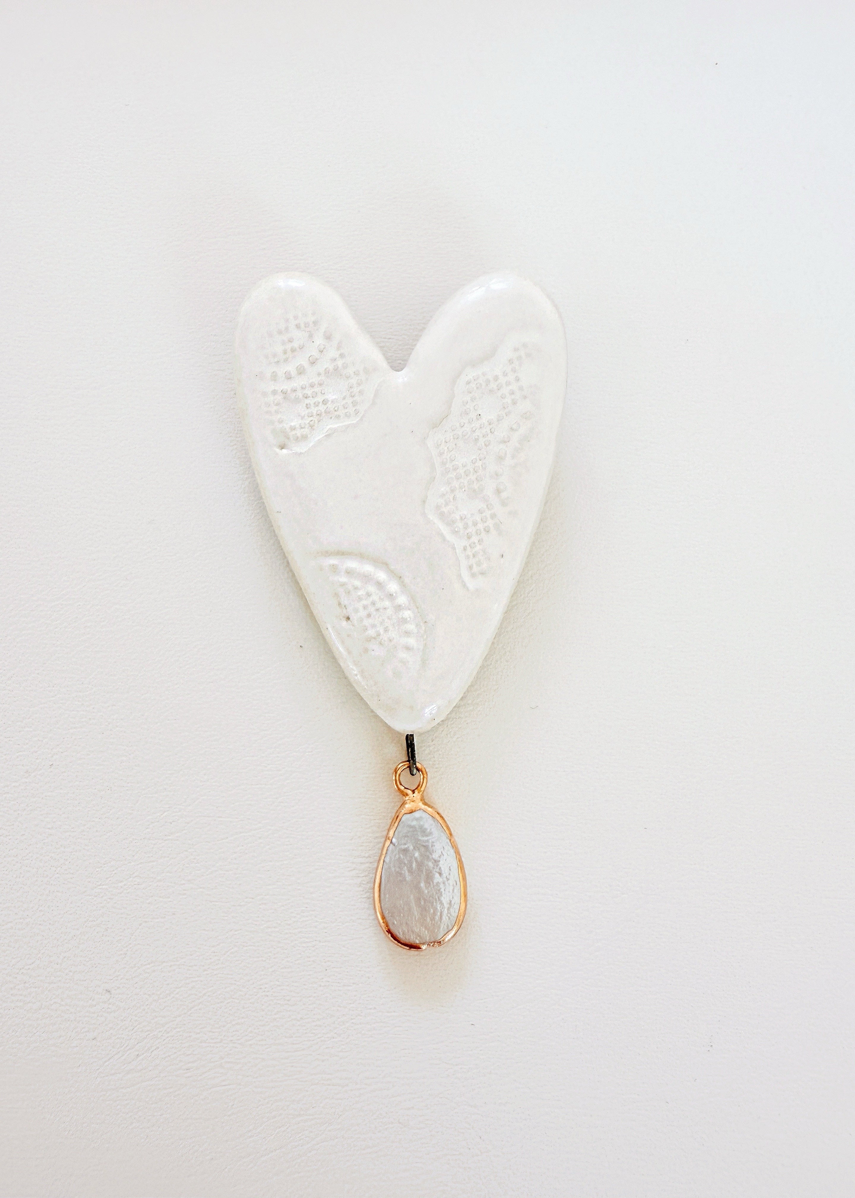 Heart with dangling Pearl - White lace
