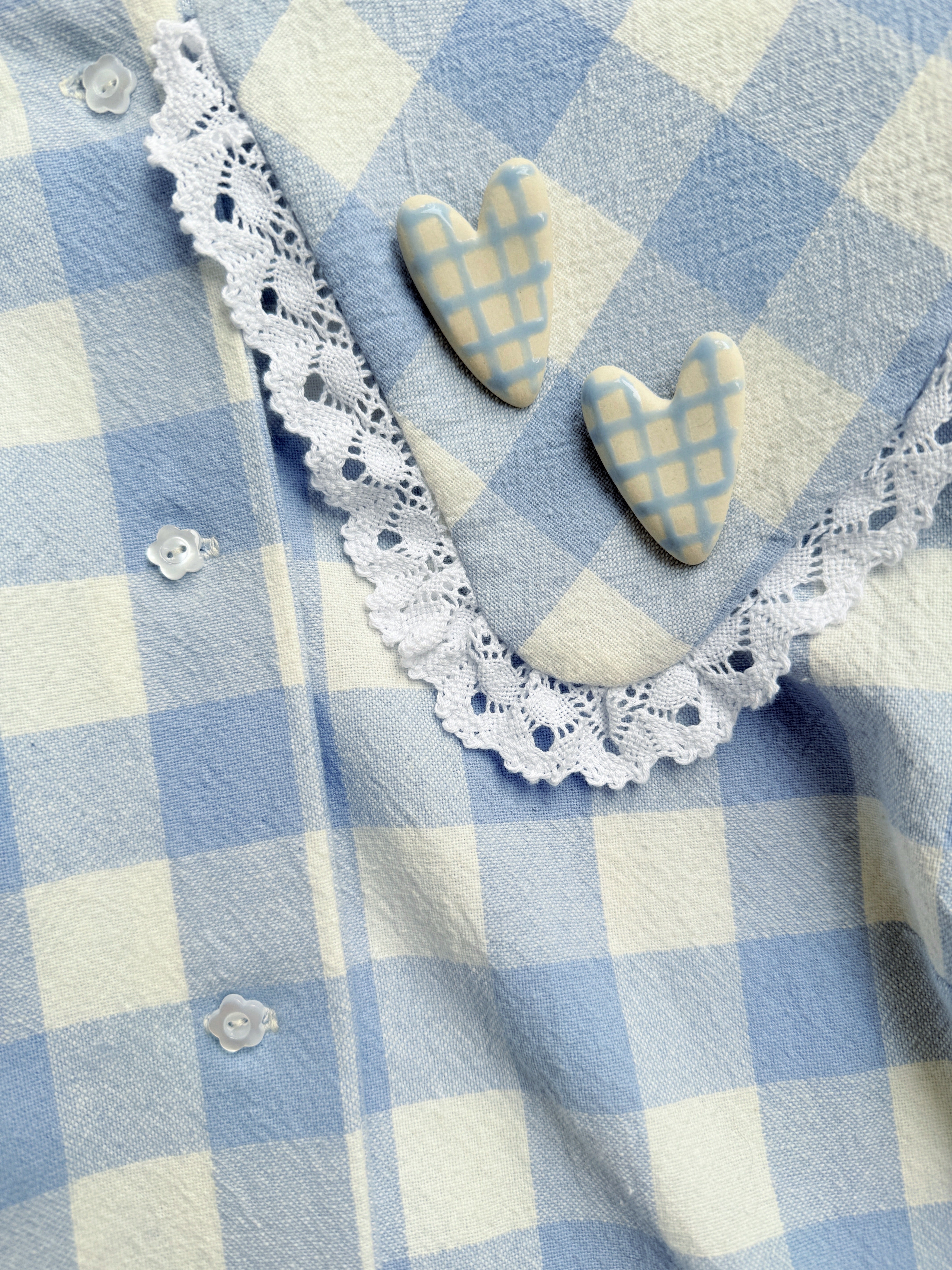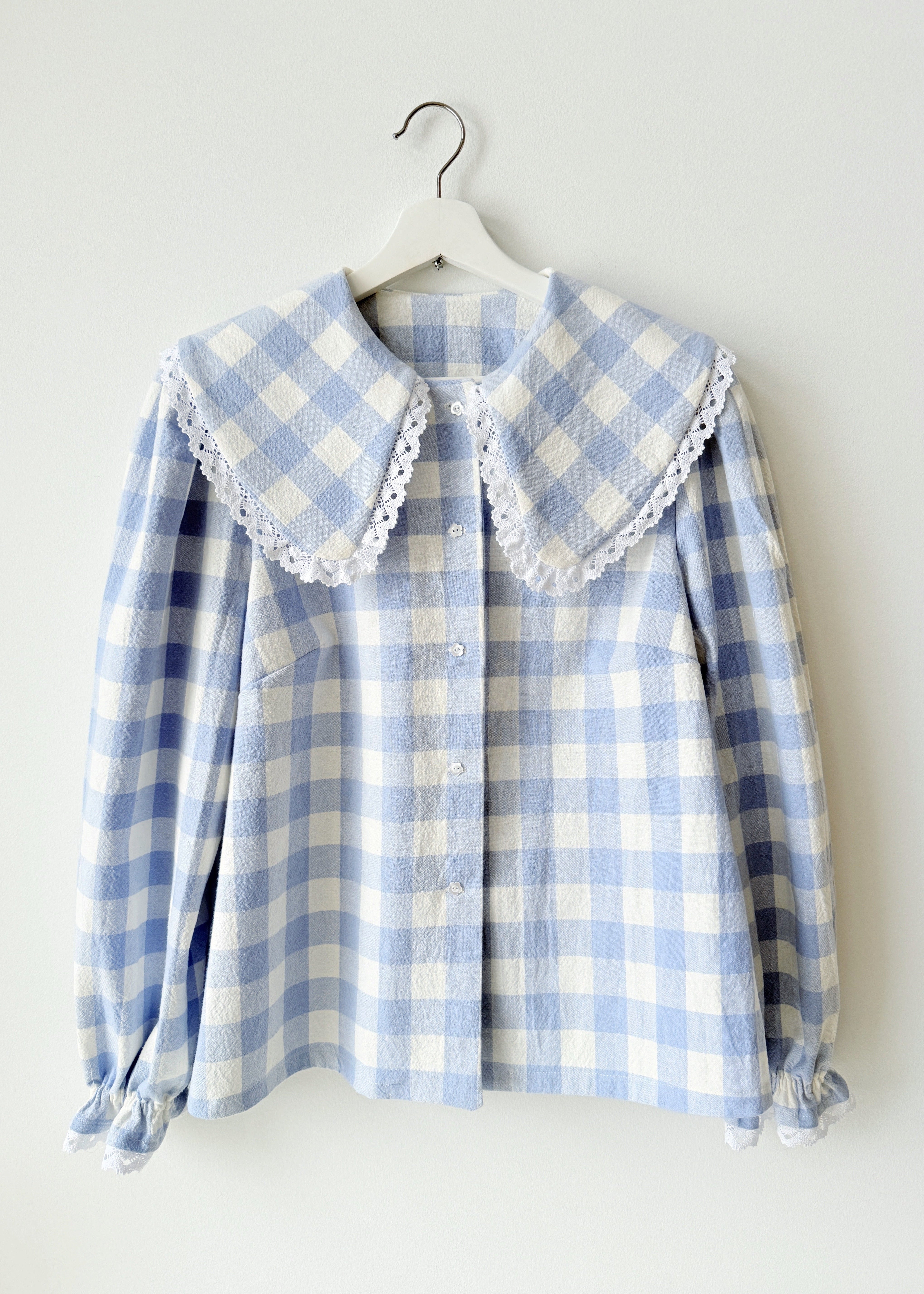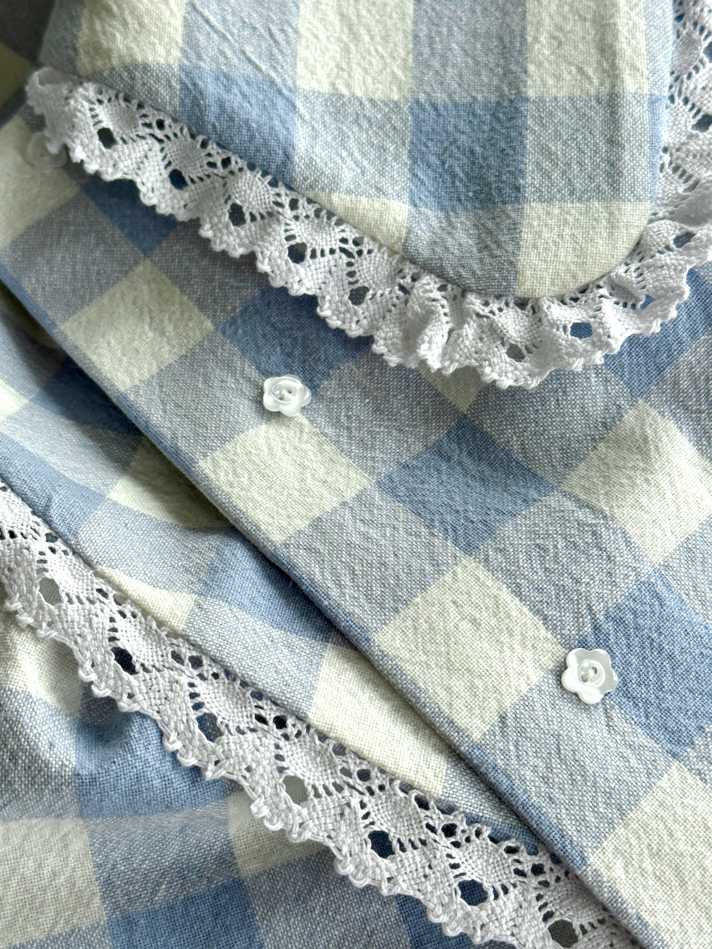 Cotton lace details in collar and cuffs. Made in France.