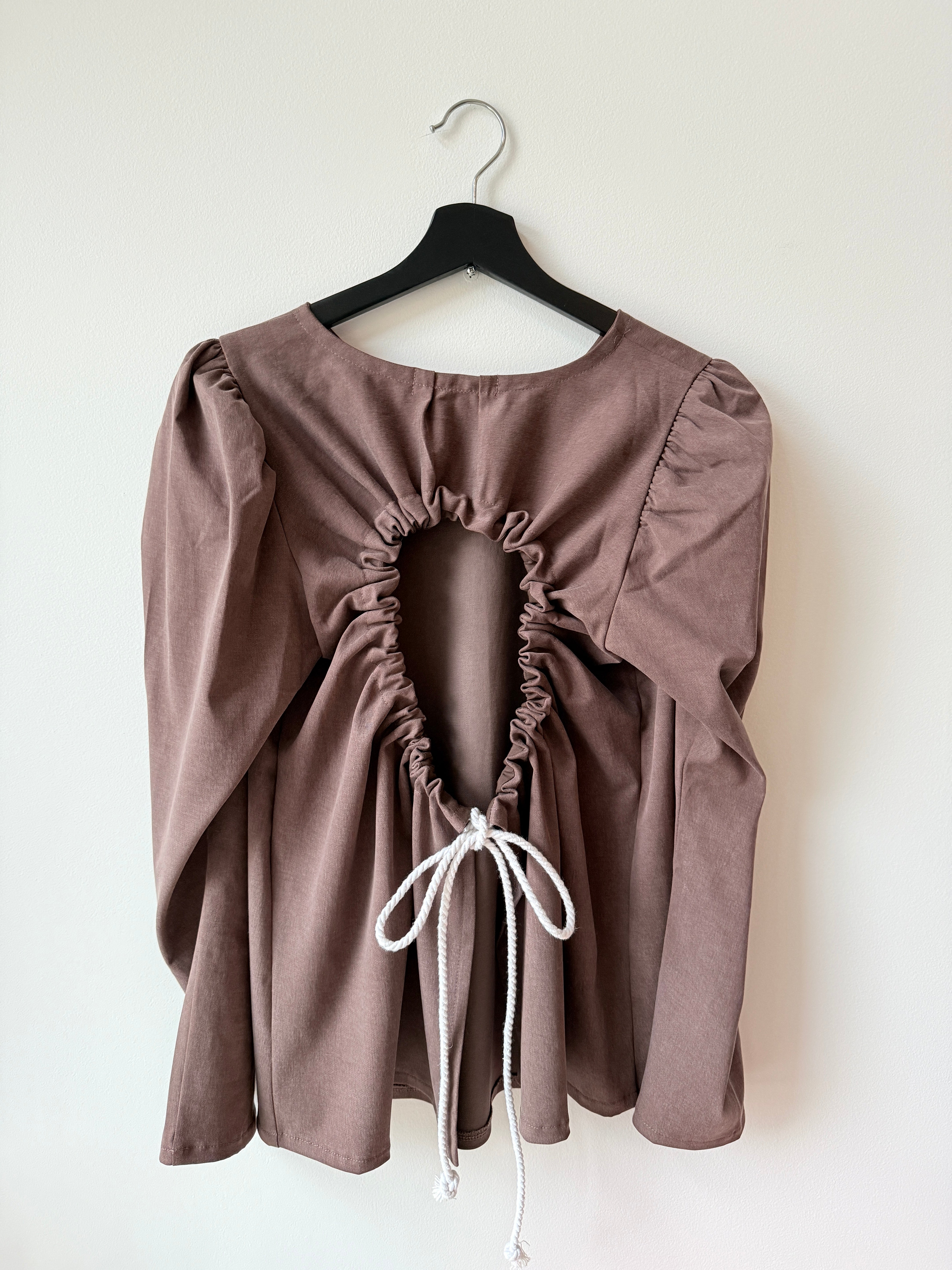 "A" shape. Slightly puffy top sleeve. Round neck. Dramatic opening at the back that closes with French cotton rope. You can decide if you want this negative space to stay open and loose making the fabric to drape beautifully or close it with a cute bow.