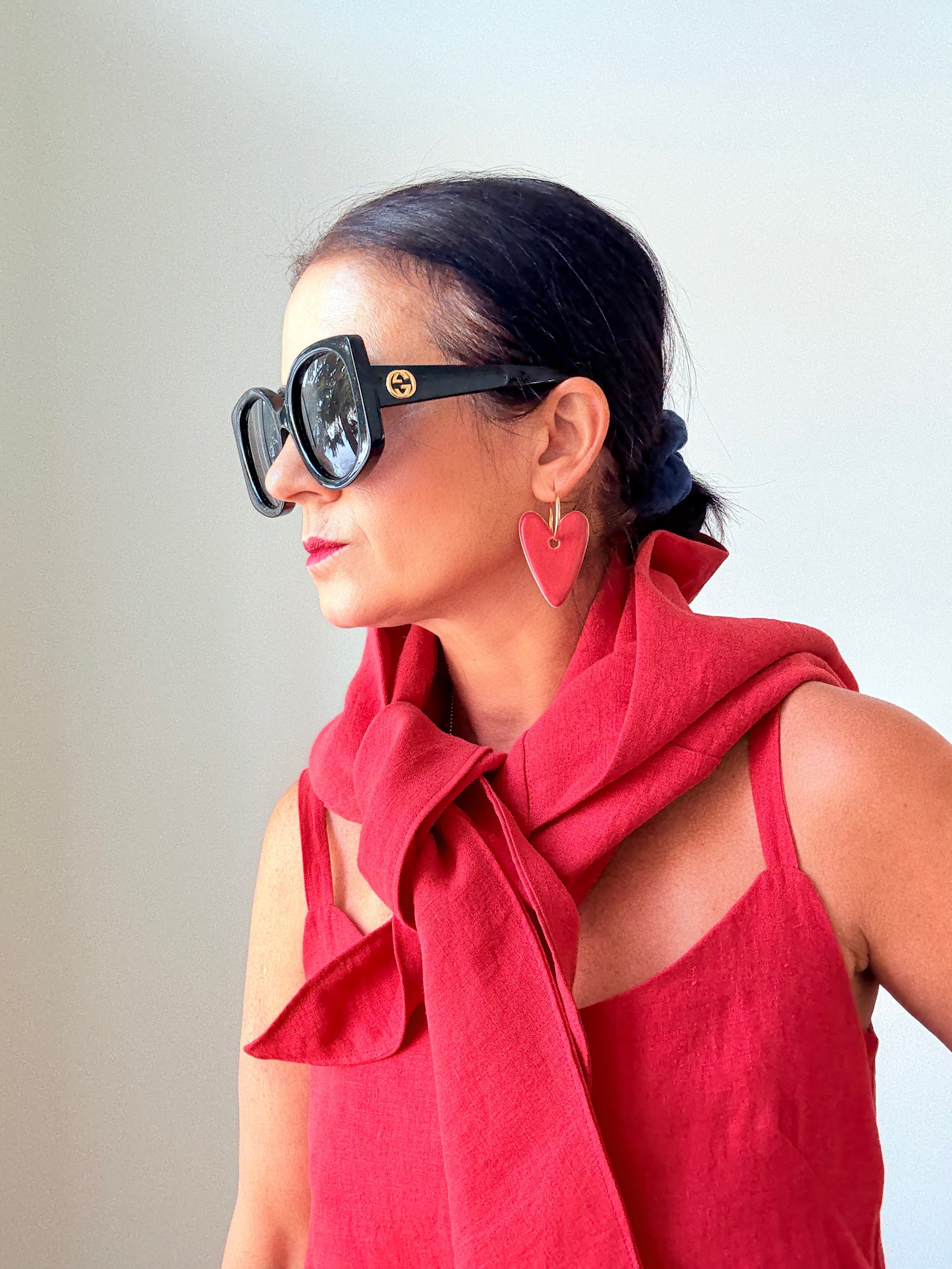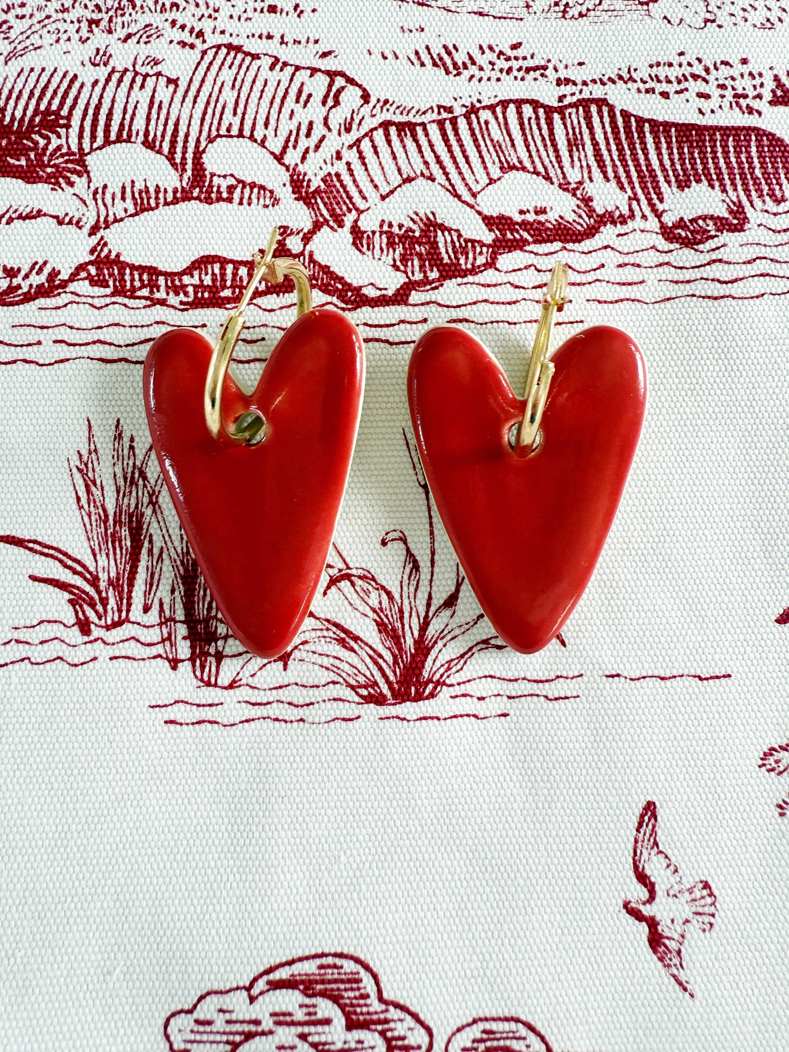 The heart earrings are made in clay in a gold loop.